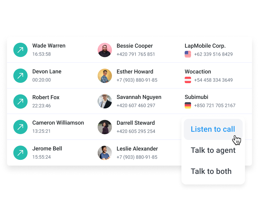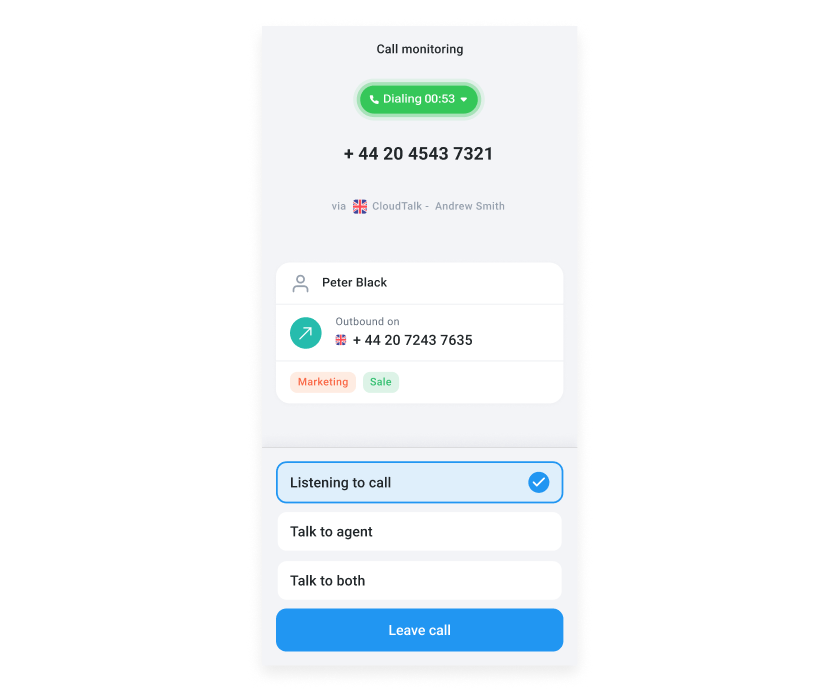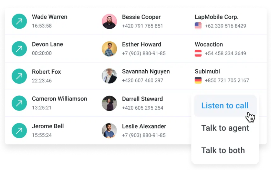 - In your CloudTalk dashboard, go to the “Call Monitoring” tab to view a list of active calls.