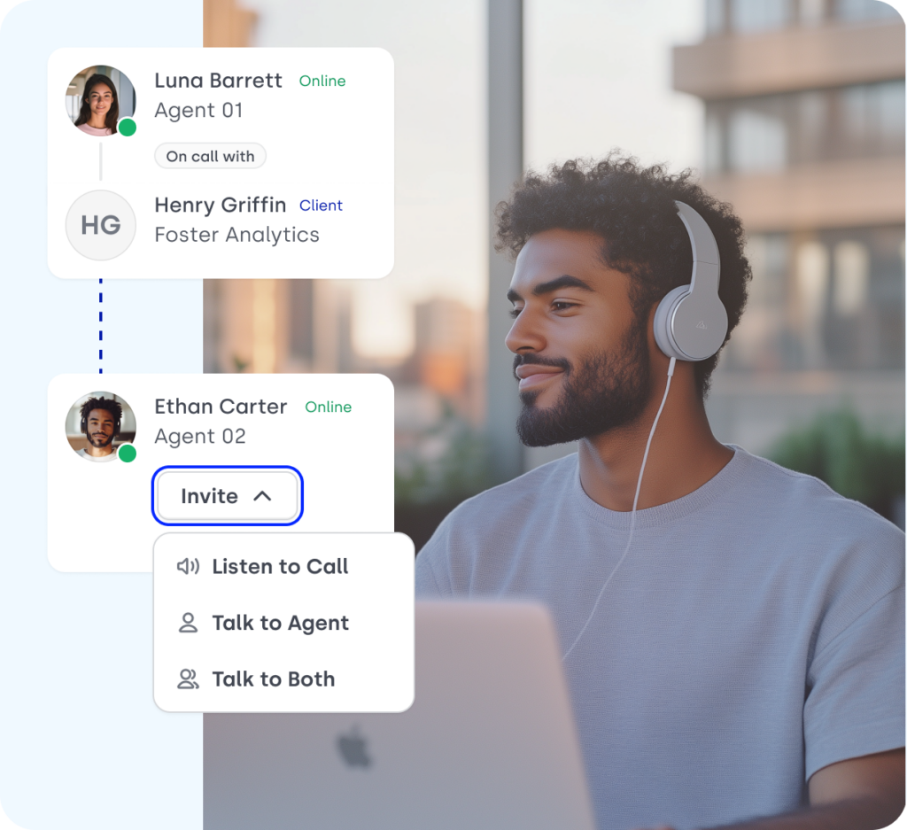 - Choose your interaction mode. Select “Listen” to monitor, “Talk to Agent” for private coaching, or “Talk to Both” for a full 3-way conversation.