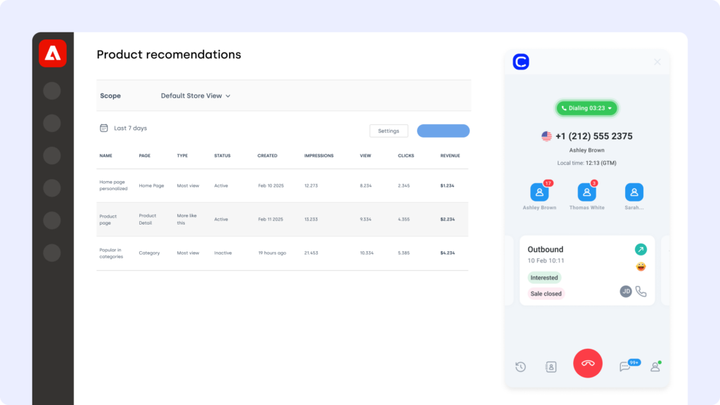 - Start making calls, logging call outcomes, and tracking interactions from Adobe Commerce.