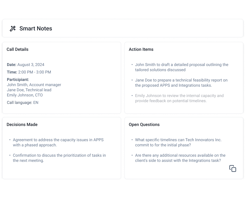 The system generates automated call notes with critical details like action items, decisions, deadlines, and follow-ups. These AI-generated call summaries help you stay on top of every conversation effortlessly, so you can focus on what matters most—getting things done.