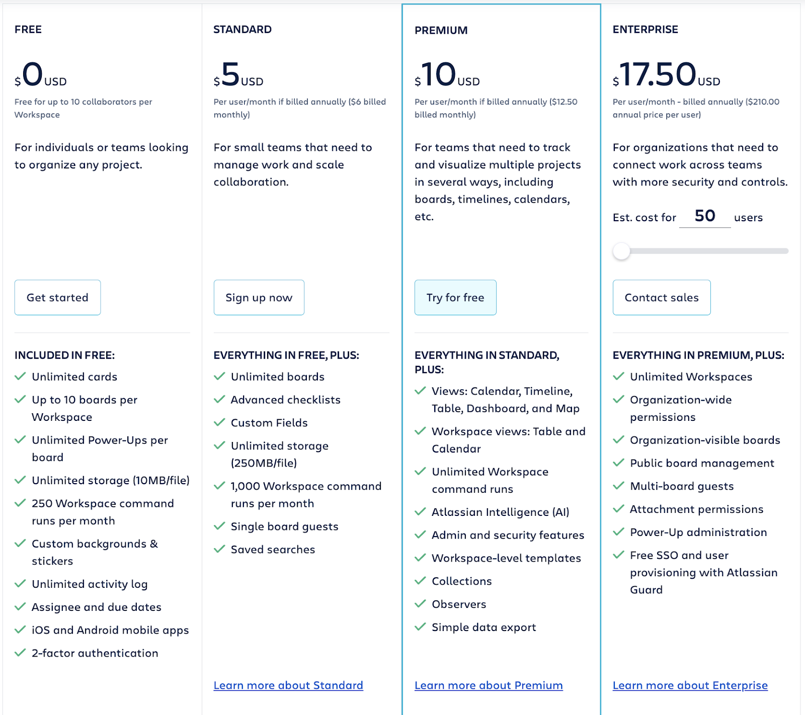 - Standard ($5/user/month): Includes advanced checklists, unlimited boards, and custom fields.