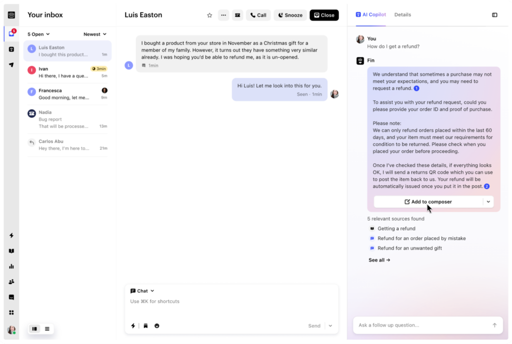 Intercom is a customer messaging platform that utilizes AI to provide personalized and efficient customer support experiences. Intercom’s AI-powered bot, Fin, is a cutting-edge customer support tool designed with OpenAI’s advanced language models.