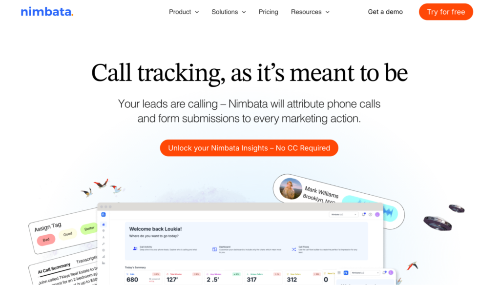Nimbata is a call tracking and conversation intelligence platform that helps businesses attribute calls, manage leads, and extract insights from conversations. It supports marketing attribution with tracking numbers, call flow automation, and AI-powered call summaries.