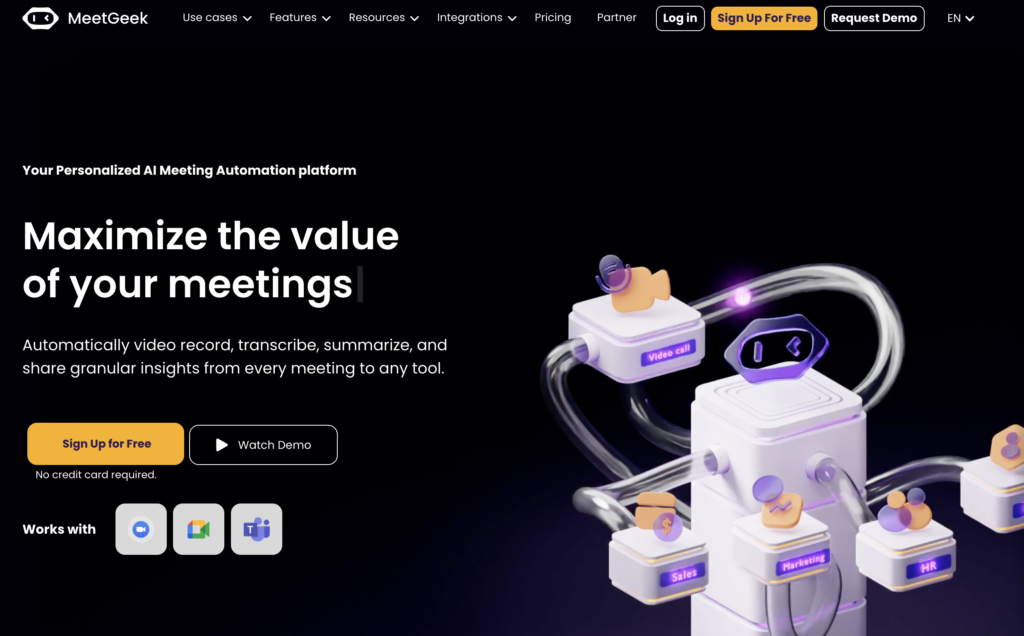 MeetGeek is an AI-powered meeting automation platform that records, transcribes, and summarizes meetings on Zoom, Google Meet, and Microsoft Teams. It automates note-taking, extracts key insights, and integrates with tools like Notion, Slack, and HubSpot, helping teams save time, improve collaboration, and stay focused on what truly matters.