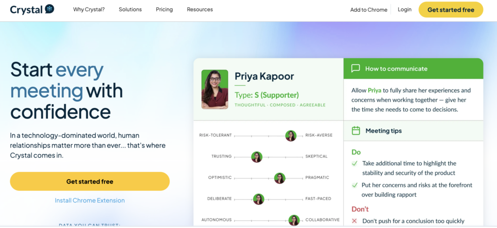 Crystal Knows is a personality data platform that helps you understand anyone’s communication style. By analyzing online data, it provides insights to personalize interactions, build stronger relationships, and improve communication.