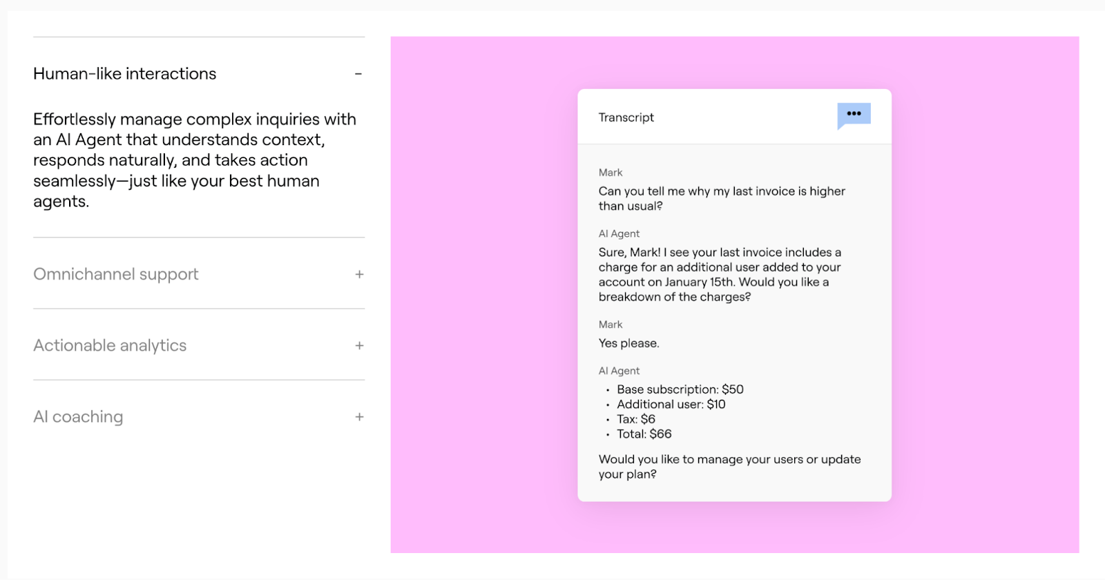 - Omnichannel Deployment: Supports web, voice, messaging apps, and more.