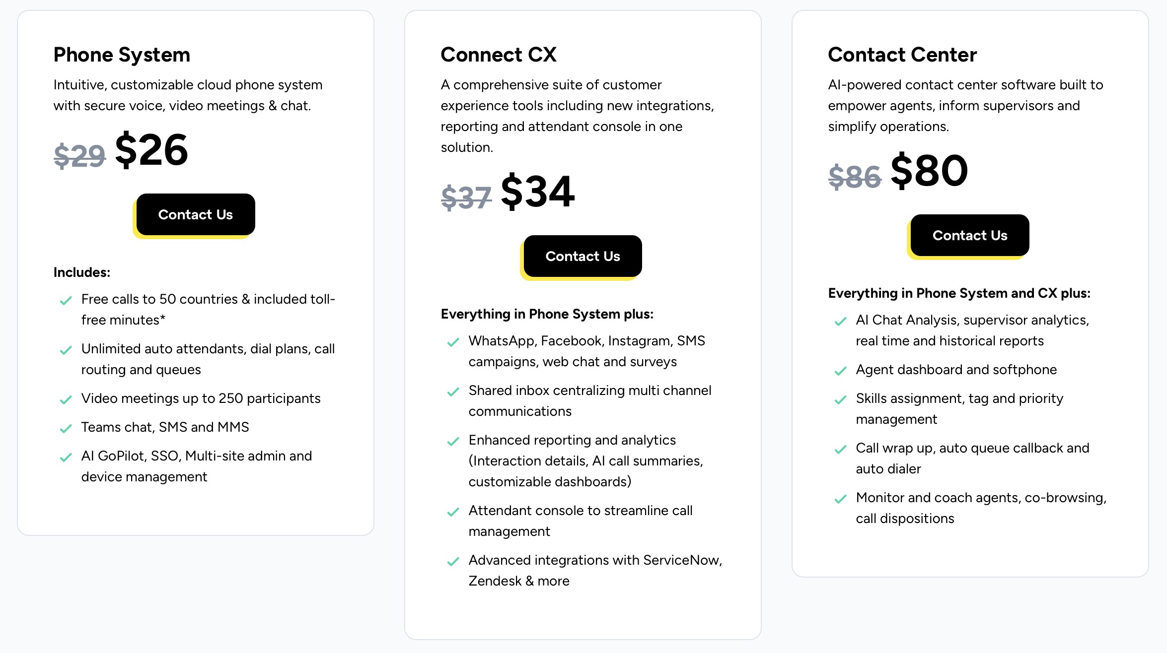 Features like native sentiment analytics, speech-to-text transcription, smart dialers, and skill-based routing are only included in Contact Centre Solution. The same goes for some agent management features, like monitoring.