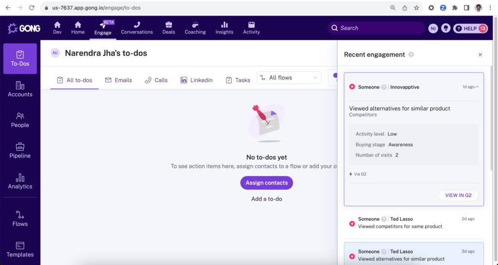 - Build targeted outreach: Personalize your sales efforts using data-driven insights. With G2 Intent signals, Gong provides a clear view of each account’s behavior and suggests the best contacts to engage based on historical data.