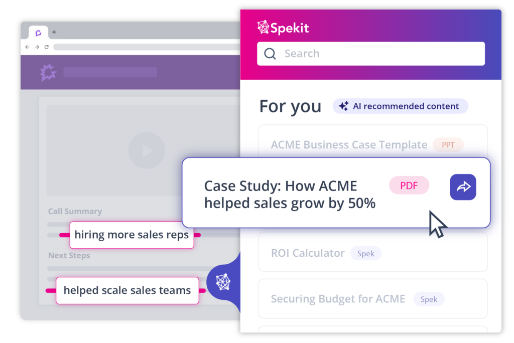 - Get the right content at the right time: Spekit AI analyzes meeting transcripts, emails, and more to automatically suggest the most relevant resources based on prospects’ needs.