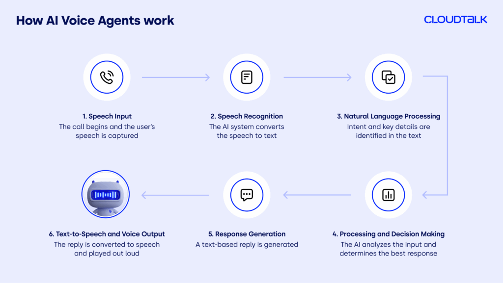 These agents let callers speak naturally (e.g., What’s the status of my order?), then use speech recognition and intent detection to route the call, respond dynamically, or trigger CRM actions.