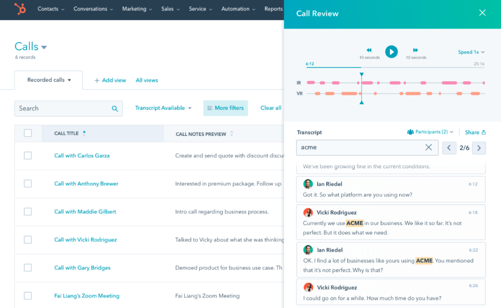 - Links directly to HubSpot’s Smart CRM so you can see prospect-specific call transcripts and recordings