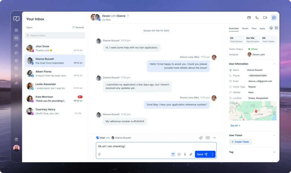 - A unified inbox where you’ll find inquiries, live chats, emails, and other interactions