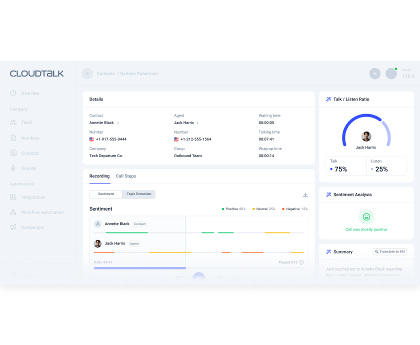 Use CloudTalk’s customer sentiment analysis to understand and improve performance.