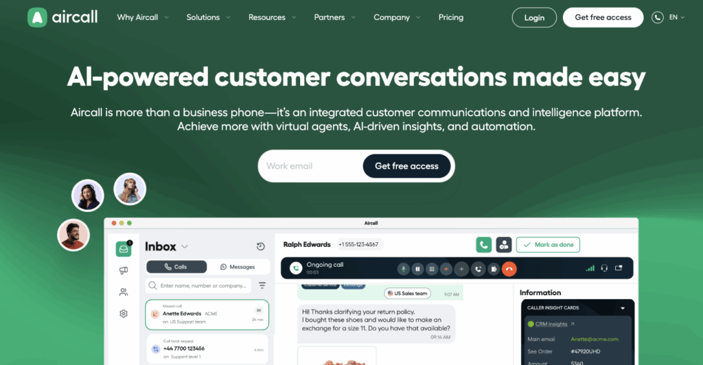 Aircall is a cloud-based phone service that works well for small real estate teams looking for simplicity, reliability, and CRM sync. While it doesn’t offer power dialing, its ease of use, strong integrations, and good UI make it a solid entry point.