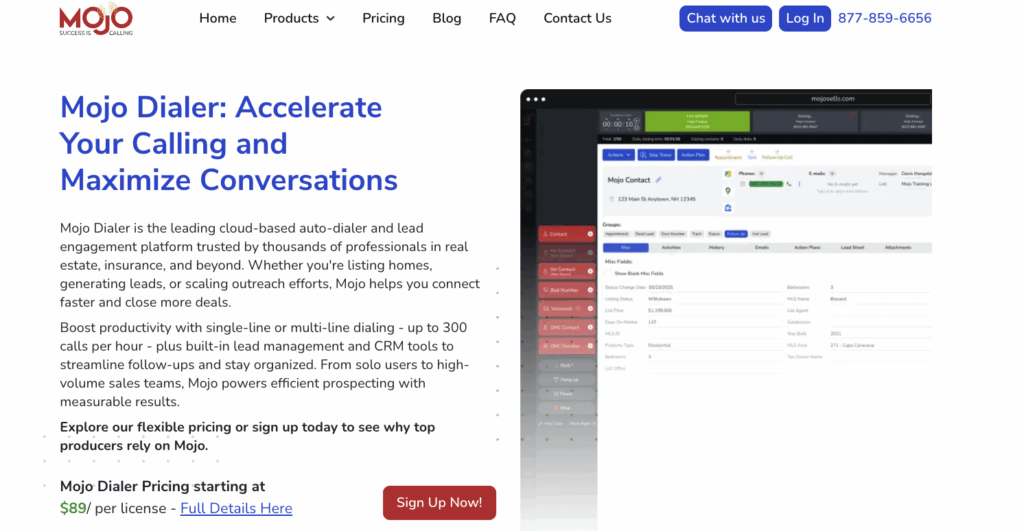 Mojo Dialer is a long-trusted real estate cold calling software that agents use mainly for FSBOs, expired listings, and large lead lists. Its standout feature is the triple-line dialer, which helps agents make up to 300 calls per hour.