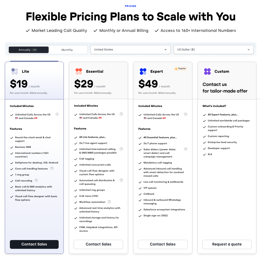 CloudTalk stands out for its flexible, pay-as-you-go pricing model that scales easily as your team grows. You can add users individually without committing to large upfront costs, making it a more budget-friendly option for expanding businesses.
