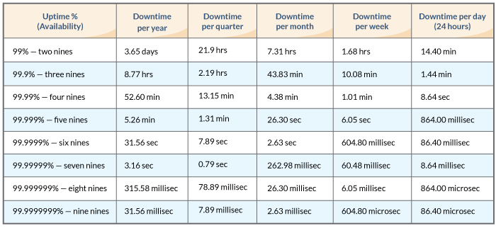 - Understanding uptime: Uptime refers to the percentage of time your service is up and running. For example, an uptime of 99% means the service is operational 99% of the time, but that still allows for about 3.65 days of downtime annually. On the other hand, 99.999% uptime (or “four nines”) translates to just 52.60 minutes of downtime per year. Providers usually list their uptime guarantees on their websites or in their Service Level Agreements (SLAs).