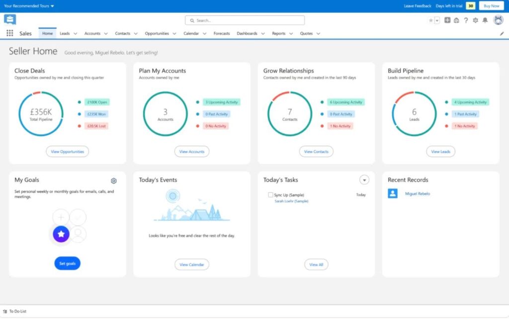 Salesforce is one of the biggest names in the CRM space, and for good reason. Its tool—Salesforce Sales Cloud—has advanced reporting capabilities, a fully customizable dashboard, a high number of integrations, and complete sales pipeline management.