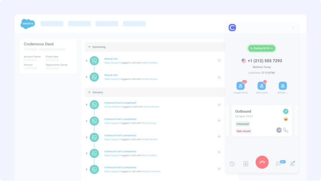 - Automatic Call Logging: Log calls, outcomes, and notes in Salesforce with minimal manual input