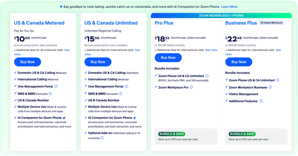 Zoom Phone integrates seamlessly with Zoom Meetings, making it a strong choice for businesses already using Zoom’s platform. It also offers basic call management features, multi-device support, and domestic SMS/MMS capabilities.