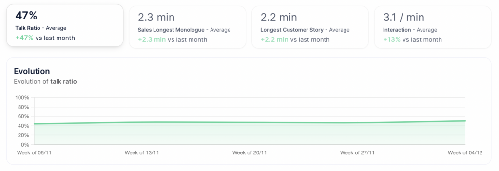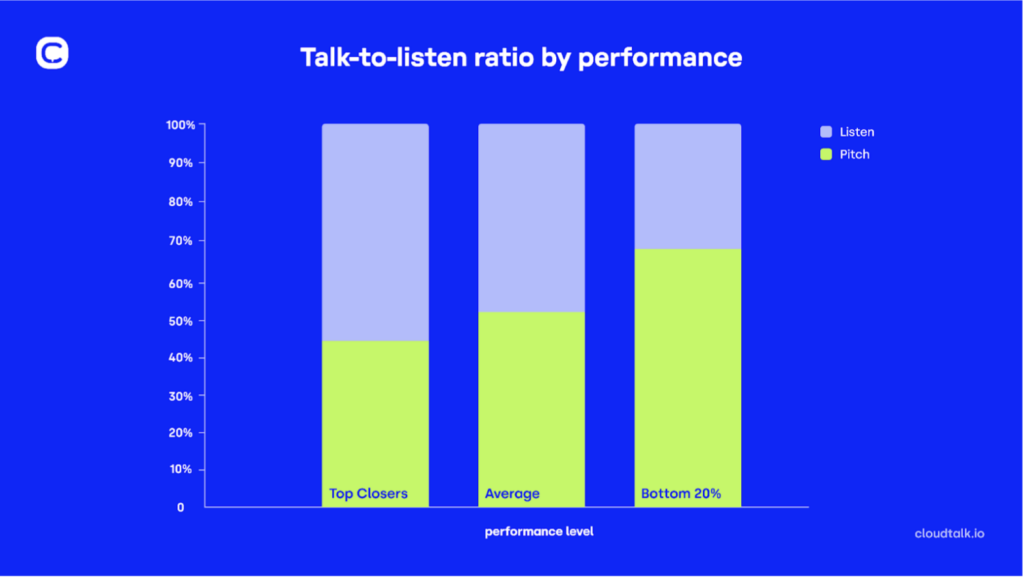 It’s scientifically proven that listening more than speaking improves win rates. An AI analysis of over 25,000 sales conversations shows that the highest-yielding reps have a talk-to-listen ratio of 43:57.