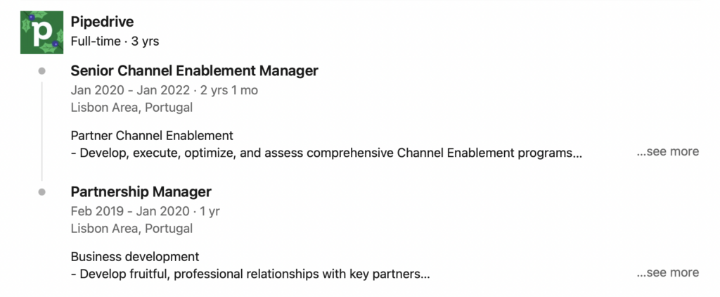 Let’s pretend that Celia isn’t our Sales Enablement Director for a moment. She is still working for Pipedrive, and she was recently promoted to Senior Channel Enablement Manager: