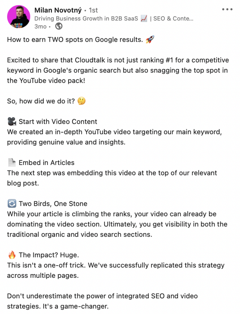 “Hey, Milan. I saw that your content earned 2 spots in Google results recently. That’s impressive! How did you achieve it?”