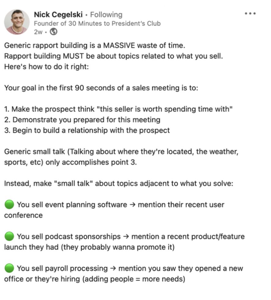 Nick Cegelski, the founder of 30 Minutes to President’s Club, nicely explains this in his LinkedIn post: