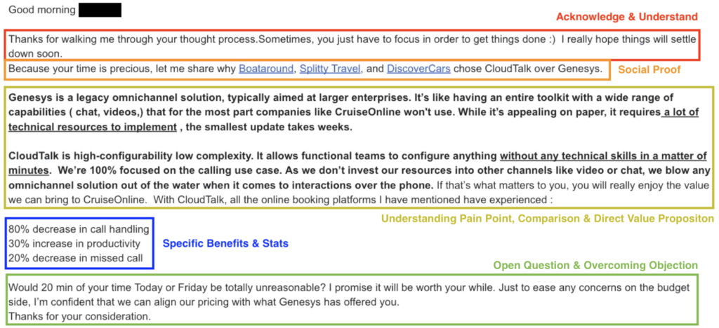 Ouch… A strict time constraint AND a competitor offering a good price on a feature the prospect wants? Genesys seemed to be meeting the lead’s BANT requirements to the T, and the situation seemed dire.