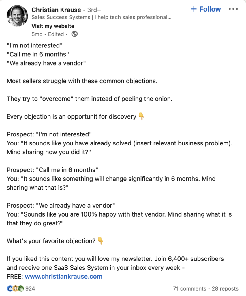 The prospects might not realize it, but their excuse is an Achilles’ heel because it gives your agents something specific to attack and leverage against them. Christian Krause, the Founder of the SaaS Sales Academy, put it best in his post here: