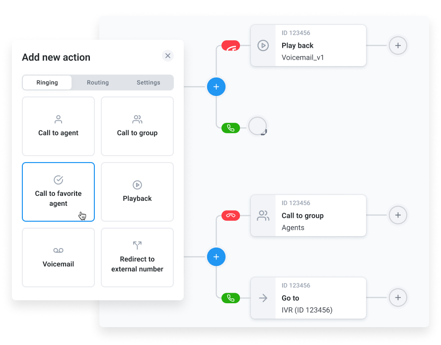 - Use the + icon to insert steps where needed (Call to agent, Call to group, IVR, Voicemail, etc).