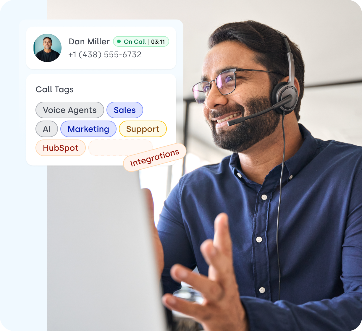 Agents tag calls during or after the call. Tags get stored in call details, can be filtered in reports, trigger workflows, and personalize future interactions.