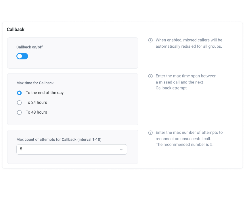 Callback-funktionen gør det muligt for agenter at ringe tilbage til kunder i henhold til deres tilgængelighed og køer.