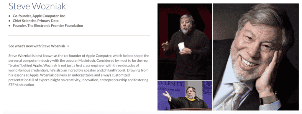 Er fährt fort, indem er die vielen Errungenschaften von Steve Wozniak hervorhebt und ihn so als eminent qualifiziert darstellt, um auf einer Veranstaltung zu sprechen, die Sie vielleicht abhalten.