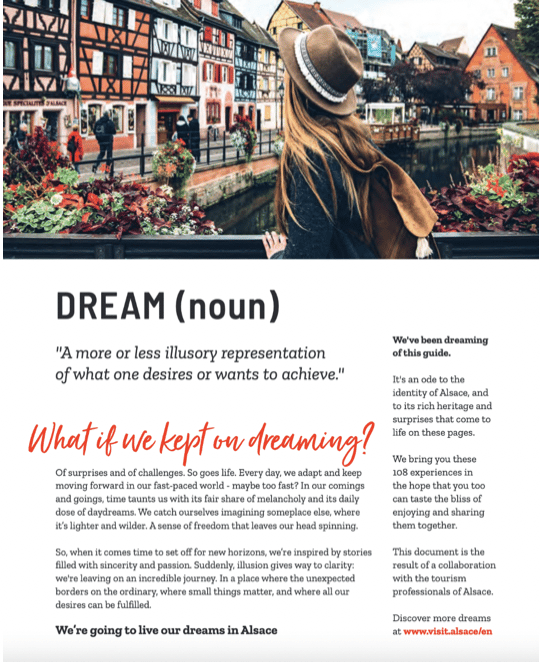Das ist ein gewagter Ansatz, der unserer Meinung nach ziemlich effektiv ist. Ein Teil des Reizes des Reisens ist die Möglichkeit, neue und magische Orte zu entdecken. Dieses Verkaufsargument spielt mit dem „Zauber“ des Elsass und lädt sein Publikum ein, dort seine Träume zu verwirklichen.