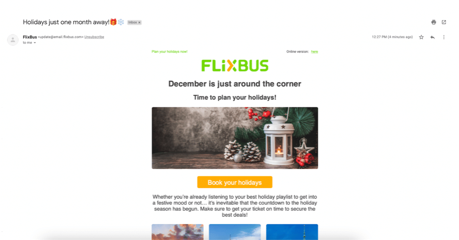 Diese E-Mail-Kampagne von FlixBus demonstriert den Nutzen von Aktualität und Dringlichkeit im Vertrieb. Der Leittext der E-Mail lautet: „Der Dezember steht vor der Tür… Zeit, Ihren Urlaub zu planen!“. Diese Art von Marketingbotschaft ist wirksam, weil sie die Jahreszeit ausnutzt und den zusätzlichen Vorteil hat, dass sie für ein Marketingteam sehr einfach zu organisieren ist. Alles, was Ihr Team tun muss, ist, die E-Mail-Nachricht zu verfassen und sie einen Monat vor den Feiertagen zu verschicken.