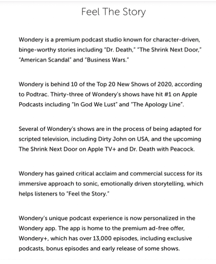 Das Wondery-Podcast-Studio produziert eine breite Palette von Erzähl-Podcasts, die sich hauptsächlich auf das Genre des historischen Dramas konzentrieren. Dieses Angebot auf der „Über uns“-Seite ihrer Website beginnt mit einer Definition des Produkts. Beachten Sie, wie sie den Ausdruck „süchtig machend“ verwenden. Obwohl es zu einer Art Modewort in der Produktion audiovisueller Inhalte geworden ist, spricht es stark für die Qualität der von Wondery produzierten Inhalte. Im weiteren Verlauf der Präsentation wird auf mehrere Auszeichnungen hingewiesen, die das Studio für seine Podcasts erhalten hat. Ein wichtiger Aspekt der Präsentation ist die natürliche Einbeziehung des Slogans des Unternehmens, „die Geschichte fühlen“. Im Allgemeinen sind Slogans ein wirksames Mittel, um sicherzustellen, dass die Botschaften Ihres Unternehmens über alle Ihre verschiedenen Kommunikationskanäle hinweg einen einheitlichen Klang haben.