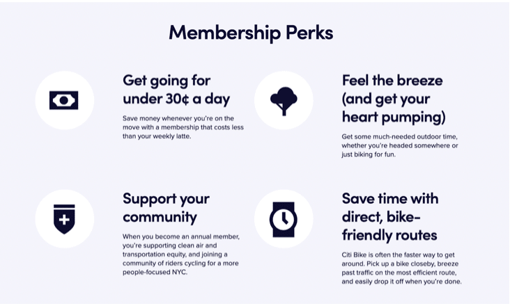 Dieses Verkaufsargument für das NYC-basierte Citi Bike Fahrrad-Sharing-Programm ist vollgepackt mit nützlichen Informationen für potenzielle Kunden. Erstens wird der Preis für eine Mitgliedschaft auf die Kosten pro Tag heruntergebrochen. Das ist effektiv, denn es lässt die Mitgliedschaft äußerst erschwinglich erscheinen. Außerdem wird auf die gesundheitlichen Vorteile hingewiesen, die man durch regelmäßiges Radfahren erreichen kann. In der Werbung heißt es weiter, dass mehr Radfahrer weniger Autofahrer bedeuten, was wiederum der Umwelt zugute kommt. Schließlich wird dem Publikum vor Augen geführt, dass Fahrradfahren in einer verkehrsreichen Stadt wie New York oft die schnellere und effizientere Art der Fortbewegung ist. Insgesamt gesehen zeigt dieses Verkaufsgespräch, wie wirksam es ist, potenziellen Kunden so viele Informationen wie möglich zu geben. Die Menschen wissen das zu schätzen und fühlen sich sicher, wenn sie wissen, dass sie alles haben, was sie brauchen, um eine fundierte Entscheidung über die Nutzung Ihres Produkts oder Ihrer Dienstleistung zu treffen.