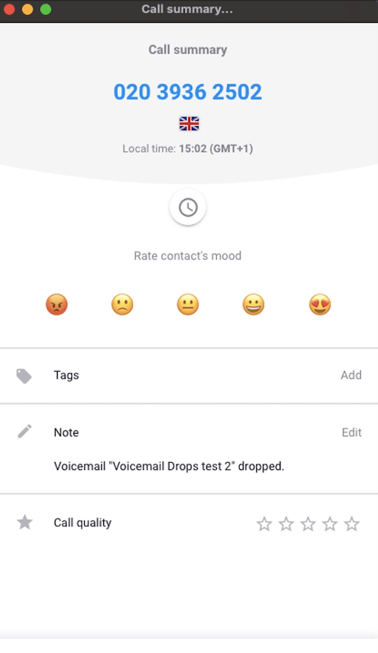 Η λειτουργία απόρριψης φωνητικού μηνύματος του CloudTalk σας επιτρέπει να ηχογραφείτε και να αποθηκεύετε εξατομικευμένα μηνύματα φωνητικού μηνύματος, τα οποία μπορούν να επιλεγούν και να σταλούν απευθείας στον τηλεφωνητή χωρίς να χτυπάει το τηλέφωνο του παραλήπτη.