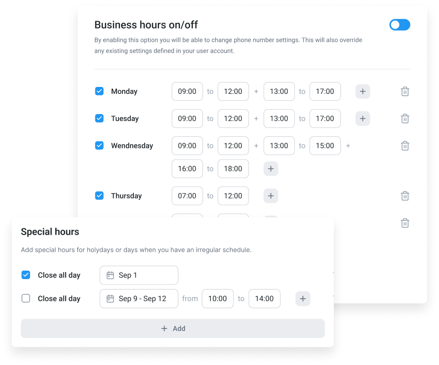 Sí, puedes establecer horarios de trabajo específicos para números de teléfono o usuarios individuales. Esta flexibilidad te permite adaptar el enrutamiento de llamadas y la disponibilidad a los distintos horarios o departamentos de tu empresa.