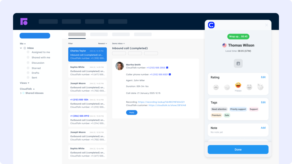 Think of Front as your central hub for customer conversations—until it’s time to talk. That’s when CloudTalk brings voice and SMS into your workflow.