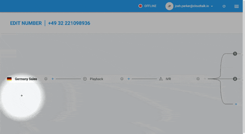 ניתן לערוך את הניתוב שלך, או IVR Menu Tree, באמצעות מעצב זרימת השיחות של CloudTalk. כדי לקבל סקירה מעמיקה יותר של ניתוב מבוסס מתקשר, קרא עוד כאן .