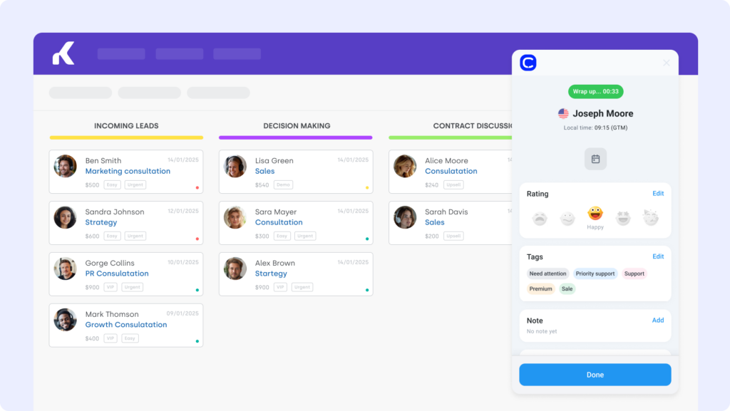 Keep your sales and support teams fully aligned with real-time call logging and two-way data synchronization. Every call, voicemail, and note is updated in Kommo CRM, ensuring your team always has the latest customer insights to personalize interactions and close deals faster.