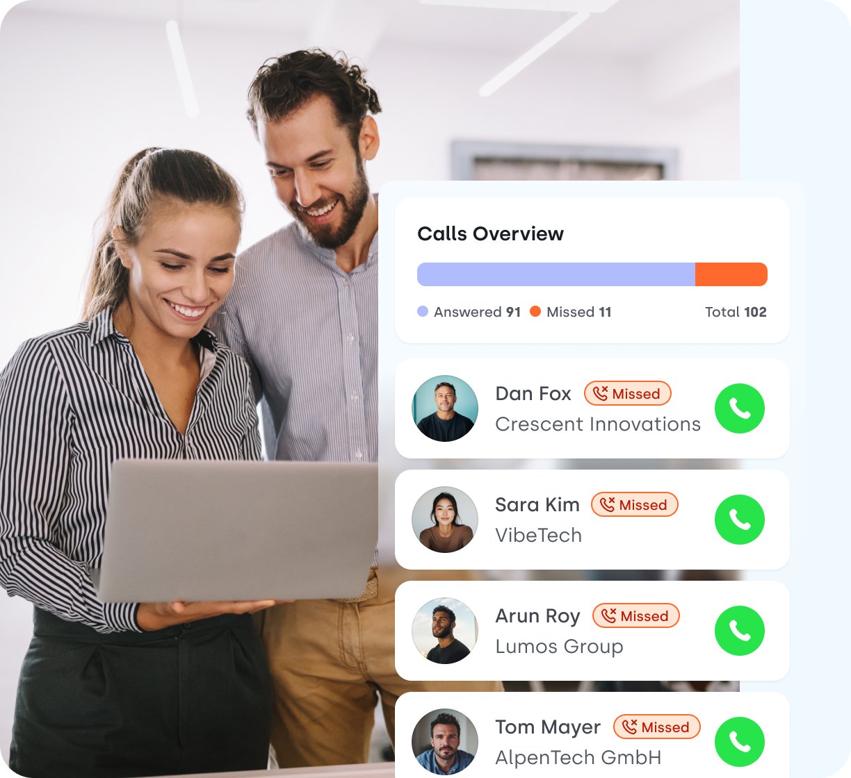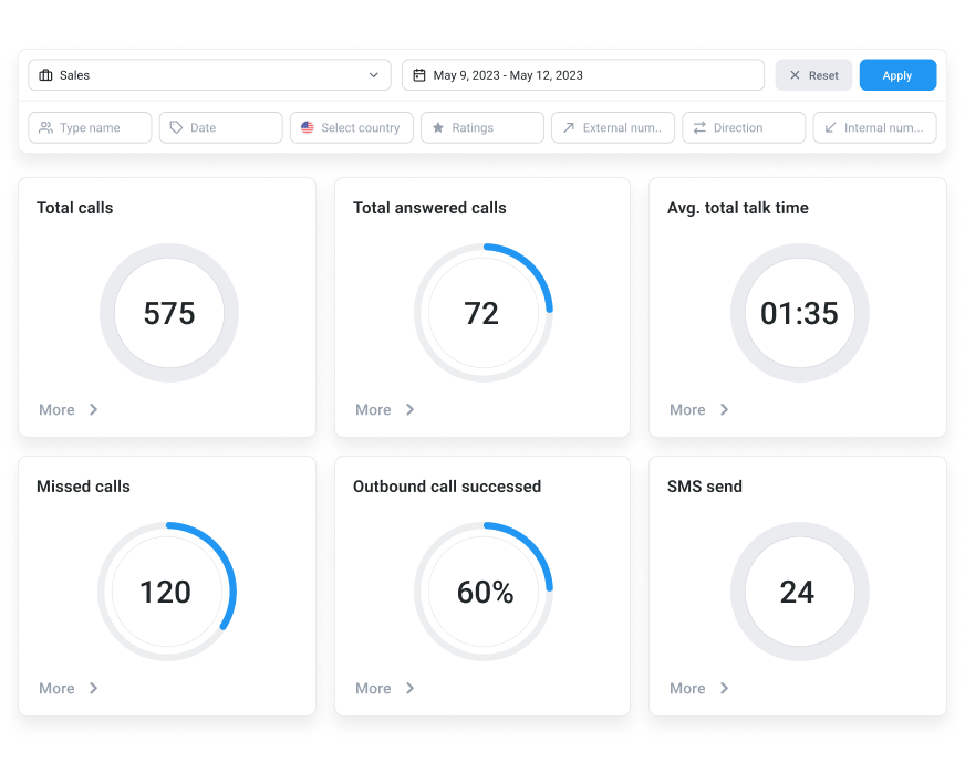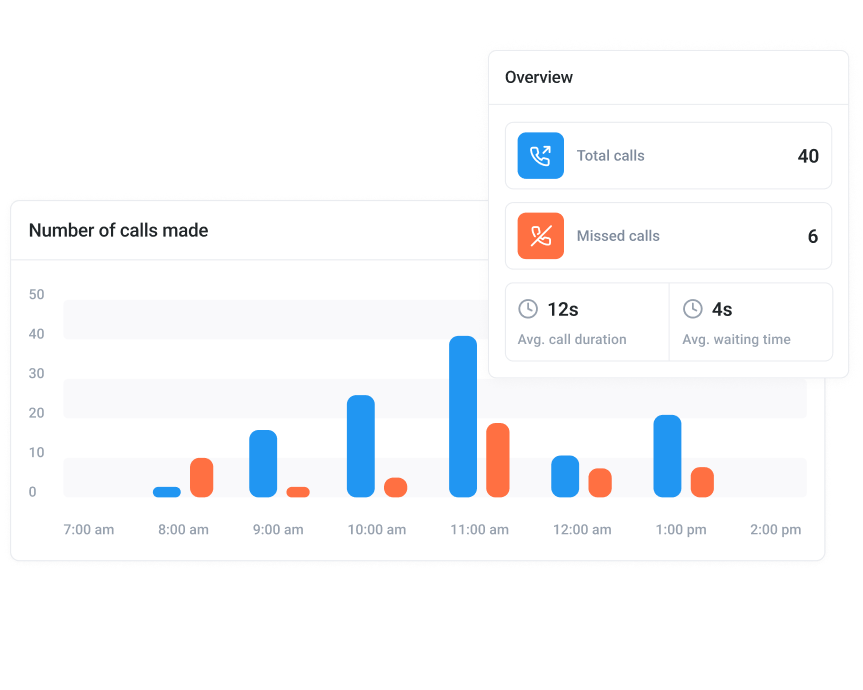- Track missed call patterns, team performance, and optimize your call handling strategy.