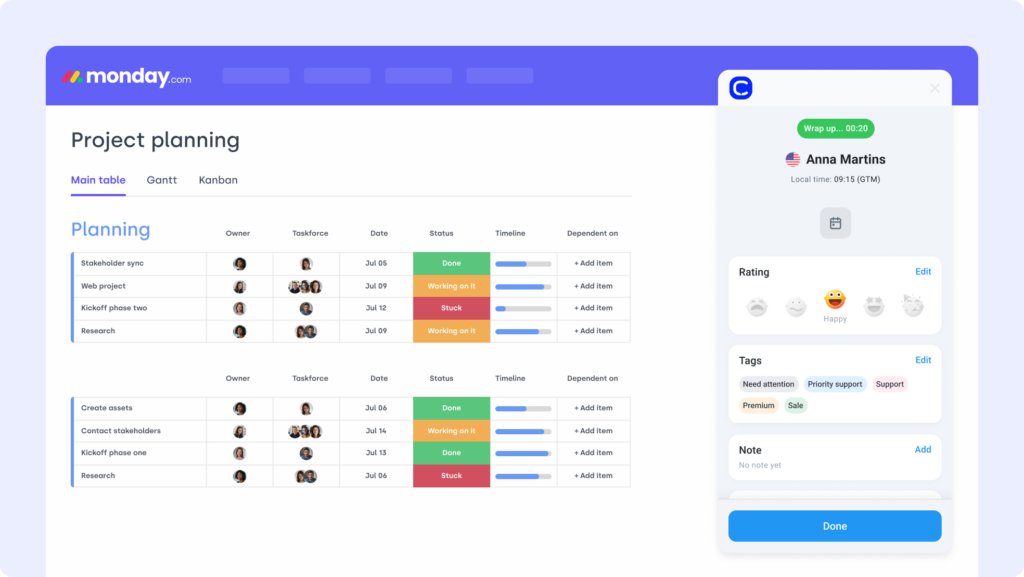 The Monday calling integration syncs contact records, logs calls as activities, and updates tags and notes in real time—enabling full CRM visibility.
