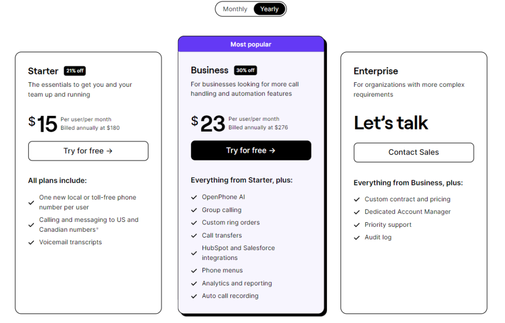 OpenPhone lacks many features essential for sales teams, such as auto dialers, click-to-call, and open API support that can help users expand the range of available integrations. Customers often complain about the low number of apps the software connects with. Additionally, the Standard option only includes calling and messaging the U.S. and Canada.