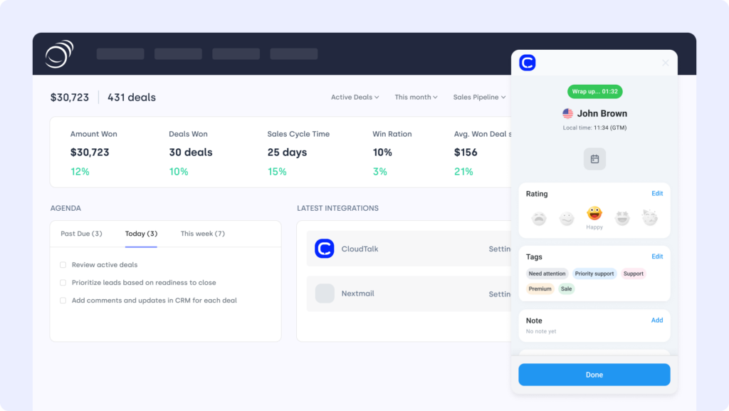 Set up the Pipeline CRM phone system integration in just a few clicks and enhance your sales and customer engagement with seamless calling, SMS, and automation. Gain real-time access to customer data, synchronize interactions, and improve sales performance with CloudTalk’s 2-way synchronization.