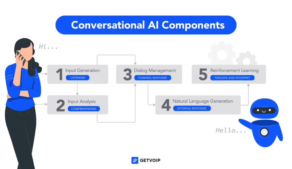 - Humanize a interação – Todos os três componentes da IA de conversação trabalham juntos, produzindo uma resposta semelhante à humana.