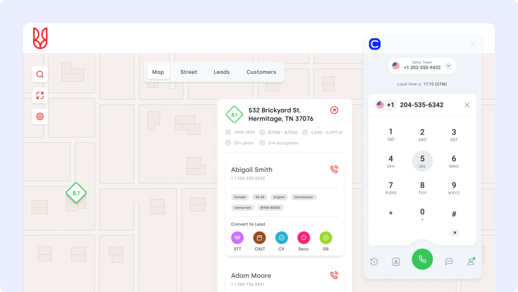 Cu ajutorul integrării telefonice SalesRabbit, CloudTalk menține reprezentanții de teren și agenții de apel complet aliniați. Solicitanții trec fără probleme de la prospectare la apelare, fără a pierde contextul critic sau impulsul.