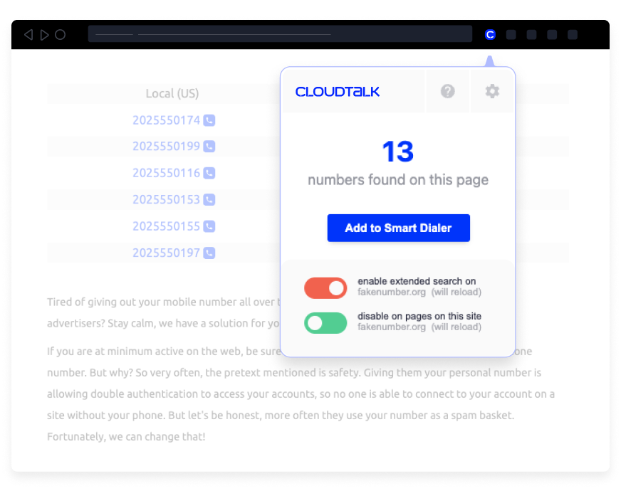 The only thing you need to start using a smart dialer is to install our click-to-call extension. Once the extension is active in your browser, it automatically scans the pages and platforms you’re browsing for phone numbers and lets you add them to your prospecting call queue.